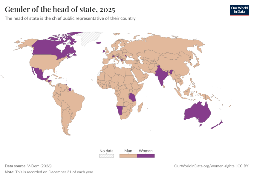 V-Dem (2026) – processed by Our World in Data. “Gender of the head of state” [dataset]. V-Dem, “Democracy report v16” [original data]. Retrieved April 10, 2026 from https://gfs-wave-2-new.owid.pages.dev:8789/20260318-112846/grapher/gender-of-the-head-of-state.html (archived on March 18, 2026).Download