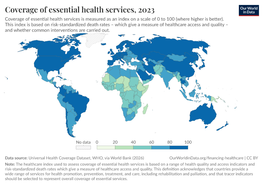 “Data Page: Coverage of essential health services”. Our World in Data (2026). Data adapted from Universal Health Coverage Dataset, WHO, via World Bank. Retrieved from https://gfs-wave-2-new.owid.pages.dev:8789/20260304-094028/grapher/healthcare-access-quality-un.html [online resource] (archived on March 4, 2026).How to cite this data