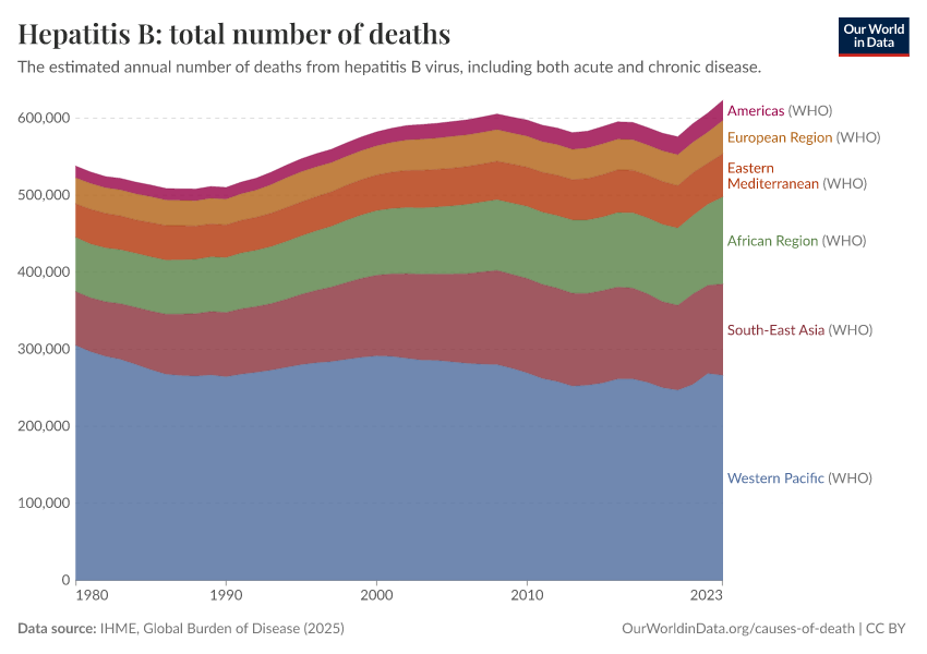 IHME, Global Burden of Disease (2025) – with major processing by Our World in Data. “Hepatitis B: total number of deaths – IHME” [dataset]. IHME, Global Burden of Disease, “Global Burden of Disease - Deaths” [original data]. Retrieved April 10, 2026 from https://gfs-wave-2-new.owid.pages.dev:8789/20260323-160356/grapher/hepatitis-b-number-of-deaths.html (archived on March 23, 2026).