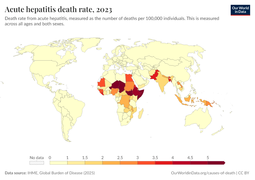 “Data Page: Acute hepatitis death rate”, part of the following publication: Esteban Ortiz-Ospina and Max Roser (2016) - “Global Health”. Data adapted from IHME, Global Burden of Disease. Retrieved from https://gfs-wave-2-new.owid.pages.dev:8789/20260323-161325/grapher/hepatitis-death-rate.html [online resource] (archived on March 23, 2026).How to cite this data