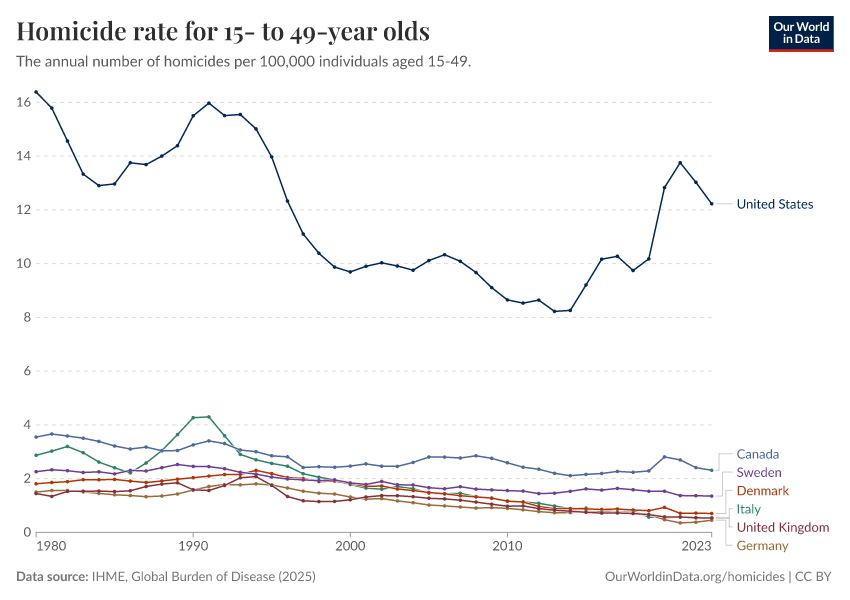IHME, Global Burden of Disease (2025) – with major processing by Our World in Data. “Homicide rate for 15- to 49-year olds – IHME” [dataset]. IHME, Global Burden of Disease, “Global Burden of Disease - Deaths” [original data]. Retrieved April 10, 2026 from https://gfs-wave-2-new.owid.pages.dev:8789/20260323-161325/grapher/homicide-rate-in-15--to-49-year-olds.html (archived on March 23, 2026).