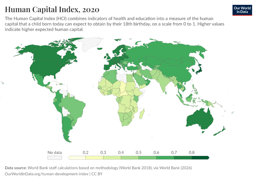 “Data Page: Human Capital Index”. Our World in Data (2026). Data adapted from World Bank staff calculations based on methodology (World Bank 2018), via World Bank. Retrieved from https://gfs-wave-2-new.owid.pages.dev:8789/20260325-171315/grapher/human-capital-index-in-2018.html [online resource] (archived on March 25, 2026).How to cite this data