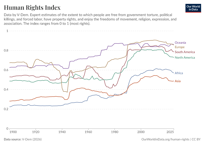 V-Dem (2026) – processed by Our World in Data. “Human rights index – V-Dem” [dataset]. V-Dem, “Democracy report v16” [original data]. Retrieved April 10, 2026 from https://gfs-wave-2-new.owid.pages.dev:8789/20260402-164039/grapher/human-rights-index-vdem.html (archived on April 2, 2026).Download