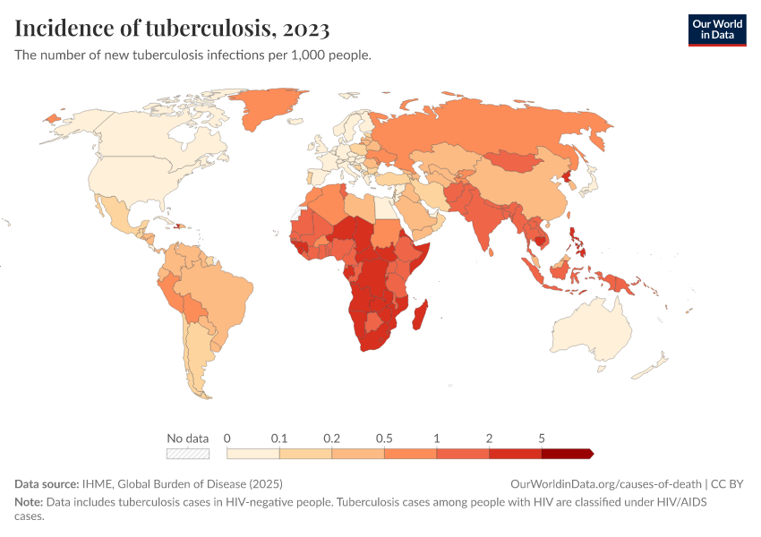 “Data Page: Incidence of tuberculosis”, part of the following publication: Esteban Ortiz-Ospina and Max Roser (2016) - “Global Health”. Data adapted from IHME, Global Burden of Disease. Retrieved from https://gfs-wave-2-new.owid.pages.dev:8789/20260319-181852/grapher/incidence-of-tuberculosis.html [online resource] (archived on March 19, 2026).How to cite this data