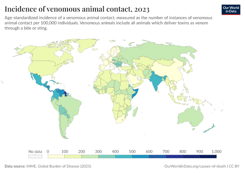 “Data Page: Incidence of venomous animal contact”, part of the following publication: Esteban Ortiz-Ospina and Max Roser (2016) - “Global Health”. Data adapted from IHME, Global Burden of Disease. Retrieved from https://gfs-wave-2-new.owid.pages.dev:8789/20260319-181852/grapher/incidence-of-venomous-animal-contact.html [online resource] (archived on March 19, 2026).How to cite this data