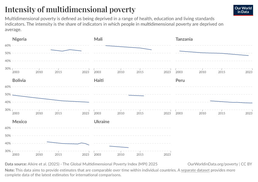 Alkire et al. (2025) - The Global Multidimensional Poverty Index (MPI) 2025 – with minor processing by Our World in Data. “Intensity of multidimensional poverty – Harmonized over time” [dataset]. Alkire et al., “Global Multidimensional Poverty Index (MPI) 2025” [original data]. Retrieved April 10, 2026 from https://gfs-wave-2-new.owid.pages.dev:8789/20260318-102956/grapher/intensity-of-multidimensional-poverty-hot.html (archived on March 18, 2026).