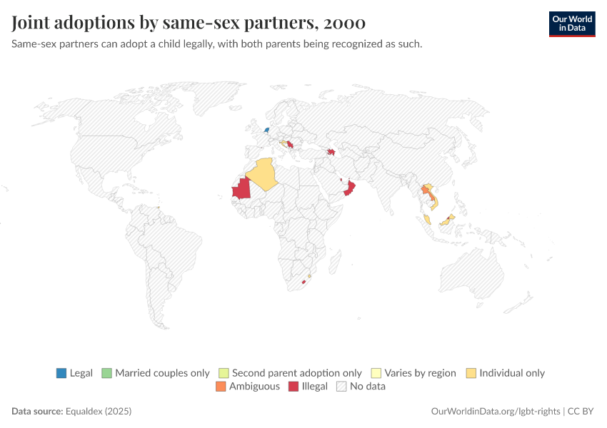 “Data Page: Joint adoptions by same-sex partners”, part of the following publication: Bastian Herre and Pablo Arriagada (2023) - “LGBT+ Rights”. Data adapted from Equaldex. Retrieved from https://gfs-wave-2-new.owid.pages.dev:8789/20260304-094028/grapher/joint-adoptions-same-sex-partners-equaldex.html [online resource] (archived on March 4, 2026).How to cite this data