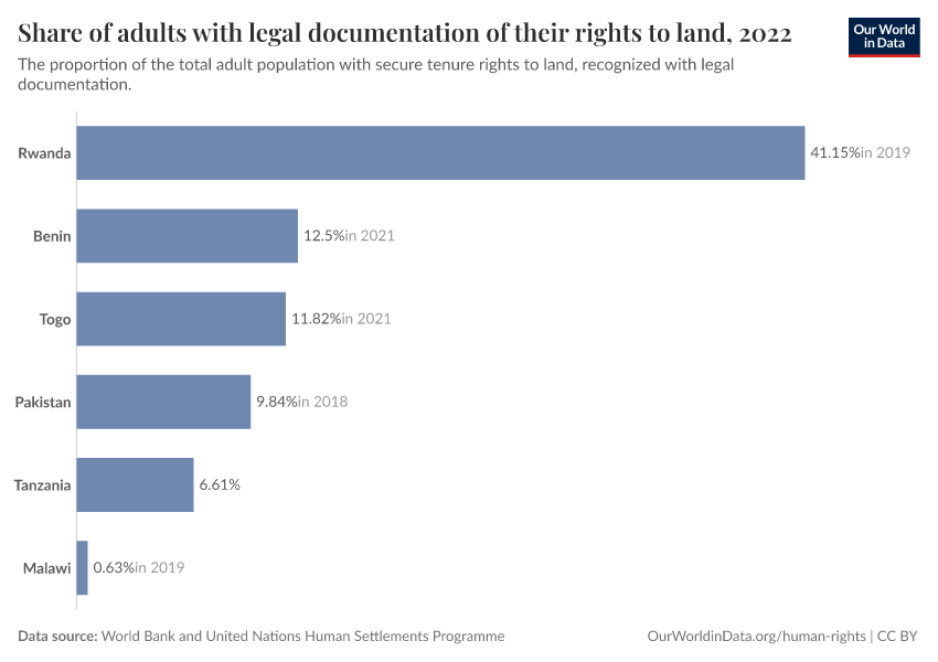 “Data Page: Share of adults with legal documentation of their rights to land”. Our World in Data (2026). Data adapted from World Bank and United Nations Human Settlements Programme. Retrieved from https://gfs-wave-2-new.owid.pages.dev:8789/20260304-094028/grapher/legally-recognized-rights-to-land.html [online resource] (archived on March 4, 2026).How to cite this data