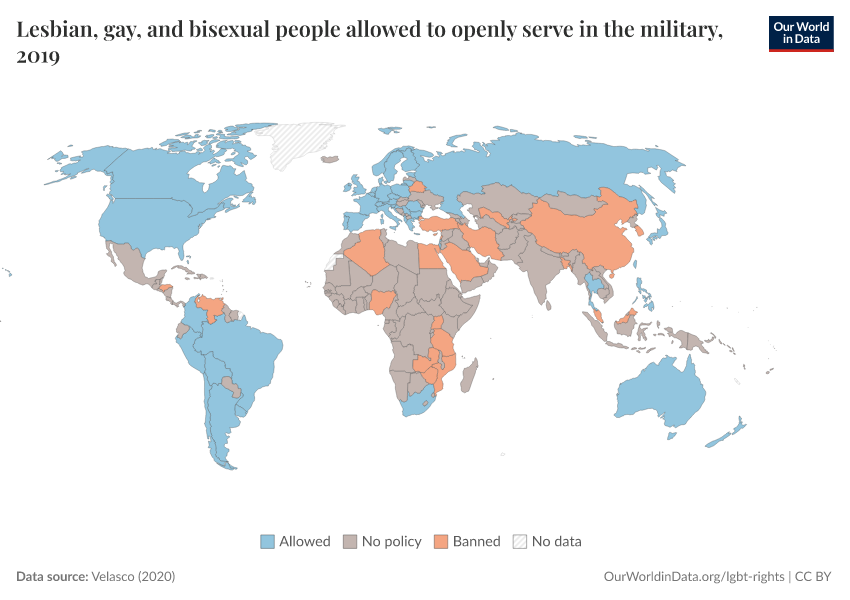 “Data Page: Lesbian, gay, and bisexual people allowed to openly serve in the military”, part of the following publication: Bastian Herre and Pablo Arriagada (2023) - “LGBT+ Rights”. Data adapted from Velasco. Retrieved from https://gfs-wave-2-new.owid.pages.dev:8789/20260304-094028/grapher/lgb-military-velasco.html [online resource] (archived on March 4, 2026).How to cite this data