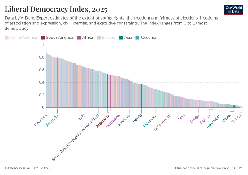“Data Page: Liberal democracy index”, part of the following publication: Bastian Herre, Lucas Rodés-Guirao, and Esteban Ortiz-Ospina (2013) - “Democracy”. Data adapted from V-Dem. Retrieved from https://gfs-wave-2-new.owid.pages.dev:8789/20260402-164039/grapher/liberal-democracy-index.html [online resource] (archived on April 2, 2026).How to cite this data