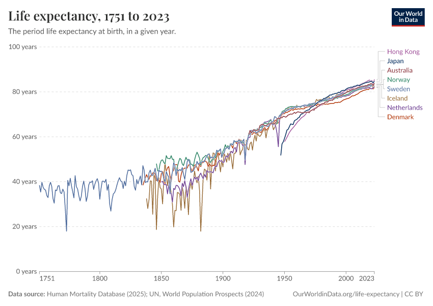 “Data Page: Life expectancy at birth”, part of the following publication: Saloni Dattani, Lucas Rodés-Guirao, Hannah Ritchie, Esteban Ortiz-Ospina, and Max Roser (2023) - “Life Expectancy”. Data adapted from Human Mortality Database, United Nations. Retrieved from https://gfs-wave-2-new.owid.pages.dev:8789/20260304-094028/grapher/life-expectancy-hmd-unwpp.html [online resource] (archived on March 4, 2026).How to cite this data