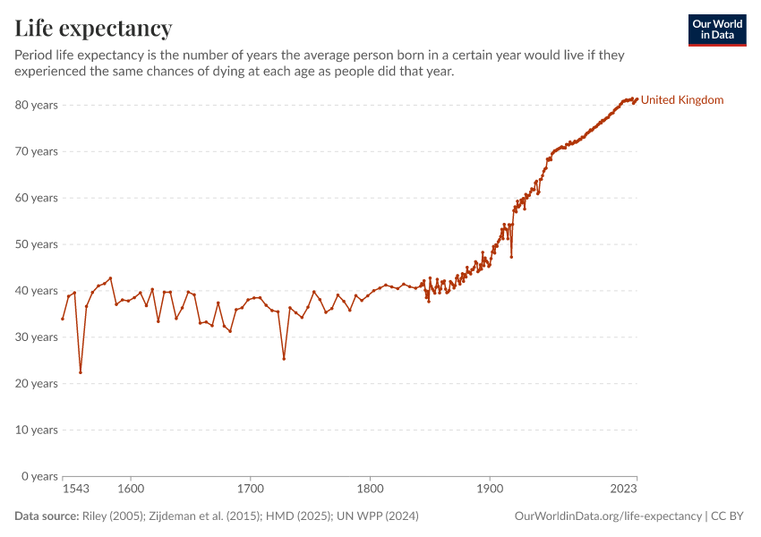 Riley (2005); Zijdeman et al. (2015); HMD (2025); UN WPP (2024) – with major processing by Our World in Data. “Life expectancy – Riley; Zijdeman et al.; HMD; UN WPP – Long-run data” [dataset]. Human Mortality Database, “Human Mortality Database”; United Nations, “World Population Prospects”; United Nations, “World Population Prospects - Interim Update”; Zijdeman et al., “Life Expectancy at birth v2”; James C. Riley, “Estimates of Regional and Global Life Expectancy, 1800-2001” [original data]. Retrieved April 10, 2026 from https://gfs-wave-2-new.owid.pages.dev:8789/20260402-164039/grapher/life-expectancy.html (archived on April 2, 2026).