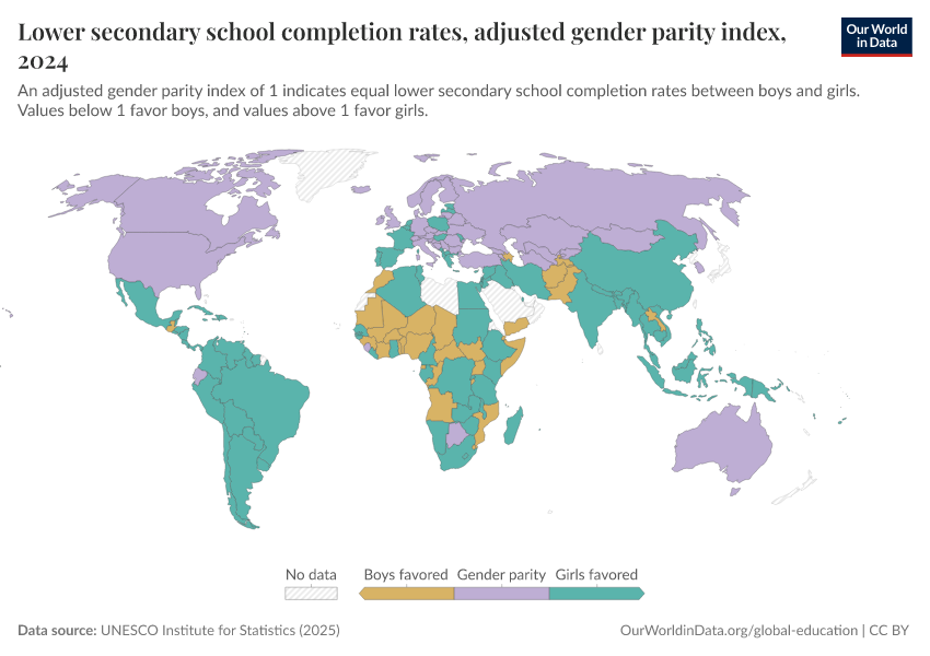 “Data Page: Lower secondary school completion rates, adjusted gender parity index”, part of the following publication: Hannah Ritchie, Veronika Samborska, Esteban Ortiz-Ospina, and Max Roser (2023) - “Global Education”. Data adapted from UNESCO Institute for Statistics. Retrieved from https://gfs-wave-2-new.owid.pages.dev:8789/20260304-094028/grapher/lower-secondary-completion-rate-adjusted-gender-parity-index.html [online resource] (archived on March 4, 2026).How to cite this data