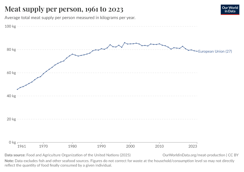 Food and Agriculture Organization of the United Nations (2025) – processed by Our World in Data. “Yearly per capita supply of all meat” [dataset]. Food and Agriculture Organization of the United Nations, “Food Balances: Food Balances (-2013, old methodology and population)”; Food and Agriculture Organization of the United Nations, “Food Balances: Food Balances (2010-)” [original data]. Retrieved April 10, 2026 from https://gfs-wave-2-new.owid.pages.dev:8789/20260402-173937/grapher/meat-supply-per-person.html (archived on April 2, 2026).Download