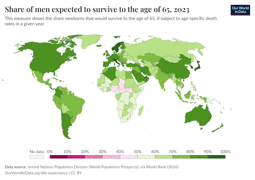 “Data Page: Share of men expected to survive to the age of 65”. Our World in Data (2026). Data adapted from United Nations Population Division (World Population Prospects), via World Bank. Retrieved from https://gfs-wave-2-new.owid.pages.dev:8789/20260304-094028/grapher/men-survival-to-age-65.html [online resource] (archived on March 4, 2026).How to cite this data