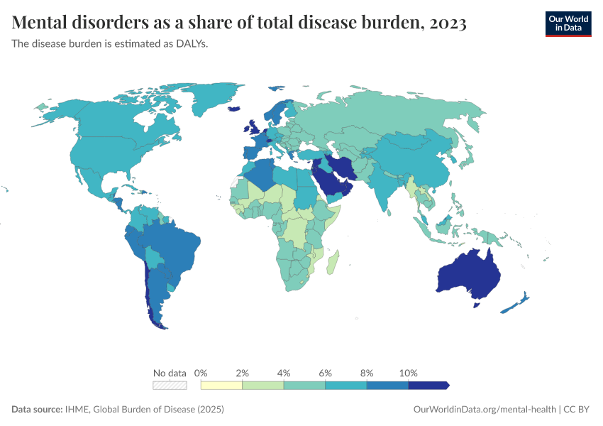 IHME, Global Burden of Disease (2025) – with major processing by Our World in Data. “Mental disorders as a share of total disease burden – IHME” [dataset]. IHME, Global Burden of Disease, “Global Burden of Disease - DALYs” [original data]. Retrieved April 10, 2026 from https://gfs-wave-2-new.owid.pages.dev:8789/20260319-180505/grapher/mental-and-substance-use-as-share-of-disease.html (archived on March 19, 2026).