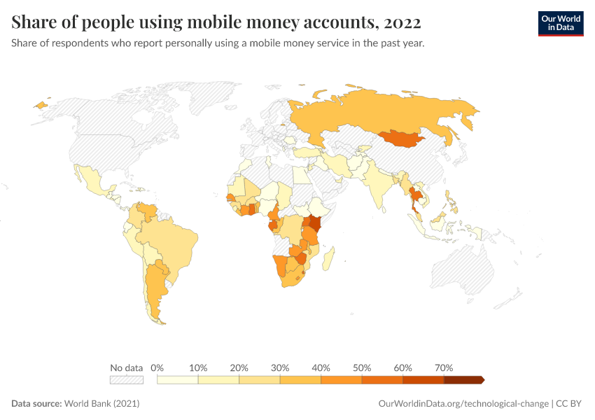 “Data Page: Share of people using mobile money accounts”, part of the following publication: Max Roser, Bertha Rohenkohl, Pablo Arriagada, Joe Hasell, Hannah Ritchie, and Esteban Ortiz-Ospina (2023) - “Economic Growth”. Data adapted from World Bank. Retrieved from https://gfs-wave-2-new.owid.pages.dev:8789/20260304-094028/grapher/mobile-money-account-usage.html [online resource] (archived on March 4, 2026).How to cite this data