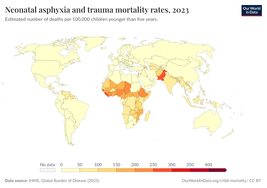 IHME, Global Burden of Disease (2025) – with major processing by Our World in Data. “Neonatal asphyxia and trauma mortality rates – IHME” [dataset]. IHME, Global Burden of Disease, “Global Burden of Disease - Deaths” [original data]. Retrieved April 10, 2026 from https://gfs-wave-2-new.owid.pages.dev:8789/20260323-161325/grapher/mortality-neonatal-asphyxia-and-trauma.html (archived on March 23, 2026).