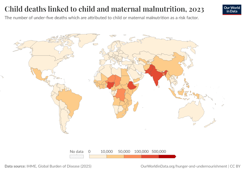 IHME, Global Burden of Disease (2025) – with major processing by Our World in Data. “Child deaths linked to child and maternal malnutrition – IHME” [dataset]. IHME, Global Burden of Disease, “Global Burden of Disease - Risk Factors - Deaths” [original data]. Retrieved April 10, 2026 from https://gfs-wave-2-new.owid.pages.dev:8789/20260319-180137/grapher/number-child-deaths-malnutrition.html (archived on March 19, 2026).