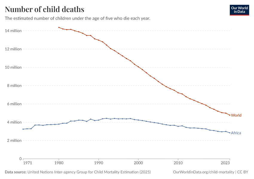 “Data Page: Under-five deaths”, part of the following publication: Saloni Dattani, Fiona Spooner, Hannah Ritchie, and Max Roser (2023) - “Child and Infant Mortality”. Data adapted from United Nations Inter-agency Group for Child Mortality Estimation, Various sources. Retrieved from https://gfs-wave-2-new.owid.pages.dev:8789/20260402-164039/grapher/number-of-child-deaths-igme.html [online resource] (archived on April 2, 2026).