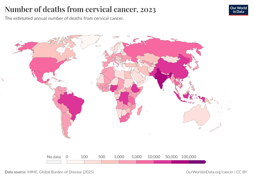 IHME, Global Burden of Disease (2025) – with major processing by Our World in Data. “Number of deaths from cervical cancer – IHME” [dataset]. IHME, Global Burden of Disease, “Global Burden of Disease - Deaths” [original data]. Retrieved April 10, 2026 from https://gfs-wave-2-new.owid.pages.dev:8789/20260323-160356/grapher/number-of-deaths-from-cervical-cancer.html (archived on March 23, 2026).