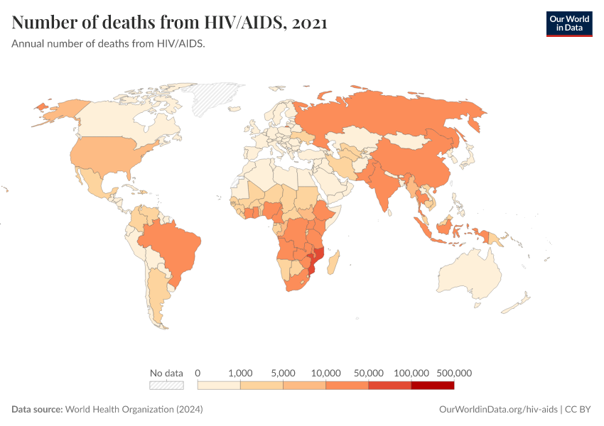 World Health Organization (2024) – with major processing by Our World in Data. “Number of deaths from HIV/AIDS” [dataset]. World Health Organization, “Global Health Estimates” [original data]. Retrieved April 10, 2026 from https://gfs-wave-2-new.owid.pages.dev:8789/20260325-171315/grapher/number-of-deaths-from-hivaids-who.html (archived on March 25, 2026).Download