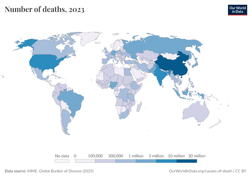 IHME, Global Burden of Disease (2025) – with major processing by Our World in Data. “Number of deaths – IHME” [dataset]. IHME, Global Burden of Disease, “Global Burden of Disease - Deaths” [original data]. Retrieved April 10, 2026 from https://gfs-wave-2-new.owid.pages.dev:8789/20260323-160356/grapher/number-of-deaths-gbd.html (archived on March 23, 2026).