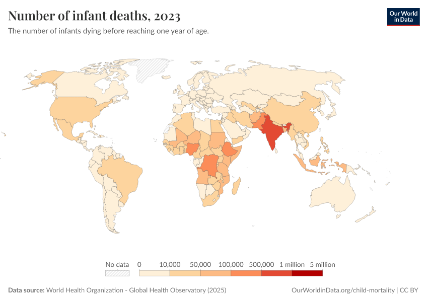 “Data Page: Number of infant deaths”. Our World in Data (2026). Data adapted from World Health Organization. Retrieved from https://gfs-wave-2-new.owid.pages.dev:8789/20260304-094028/grapher/number-of-infant-deaths-gho.html [online resource] (archived on March 4, 2026).How to cite this data