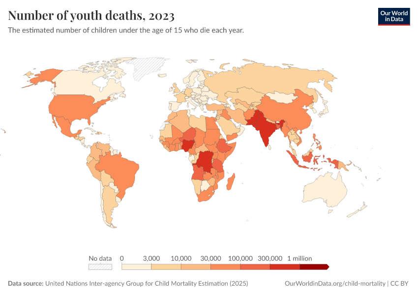 “Data Page: Under-fifteen deaths”, part of the following publication: Saloni Dattani, Fiona Spooner, Hannah Ritchie, and Max Roser (2023) - “Child and Infant Mortality”. Data adapted from United Nations Inter-agency Group for Child Mortality Estimation, UN Inter-agency Group for Child Mortality Estimation, Various sources. Retrieved from https://gfs-wave-2-new.owid.pages.dev:8789/20260402-164039/grapher/number-of-youth-deaths.html [online resource] (archived on April 2, 2026).How to cite this data