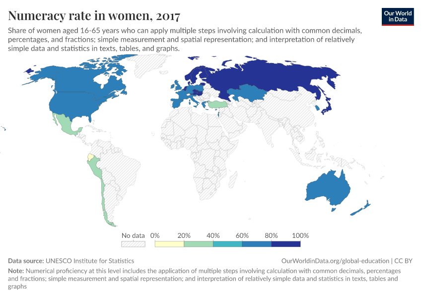 “Data Page: Numeracy rate in women”. Our World in Data (2026). Data adapted from UNESCO Institute for Statistics. Retrieved from https://gfs-wave-2-new.owid.pages.dev:8789/20260304-094028/grapher/numeracy-rate-in-adult-women-sdg.html [online resource] (archived on March 4, 2026).How to cite this data