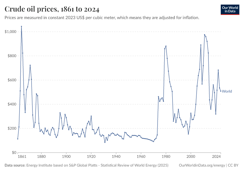 “Data Page: Oil price - Crude prices since 1861”, part of the following publication: Hannah Ritchie, Pablo Rosado, and Max Roser (2023) - “Energy”. Data adapted from Energy Institute. Retrieved from https://gfs-wave-2-new.owid.pages.dev:8789/20260304-094028/grapher/oil-prices-inflation-adjusted.html [online resource] (archived on March 4, 2026).How to cite this data
