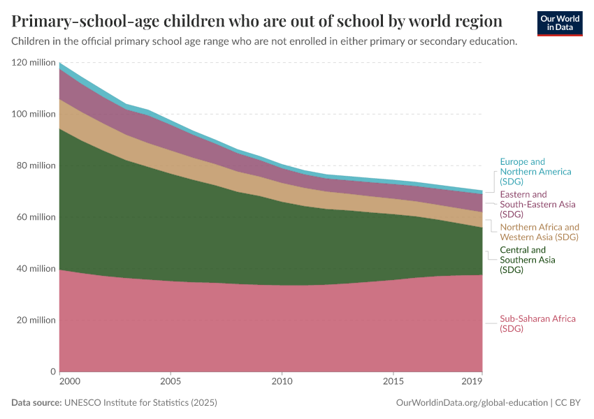 “Data Page: Out-of-school children of primary school age”, part of the following publication: Hannah Ritchie, Veronika Samborska, Esteban Ortiz-Ospina, and Max Roser (2023) - “Global Education”. Data adapted from UNESCO Institute for Statistics. Retrieved from https://gfs-wave-2-new.owid.pages.dev:8789/20260304-094028/grapher/out-of-school-children-of-primary-school-age-by-world-region.html [online resource] (archived on March 4, 2026).