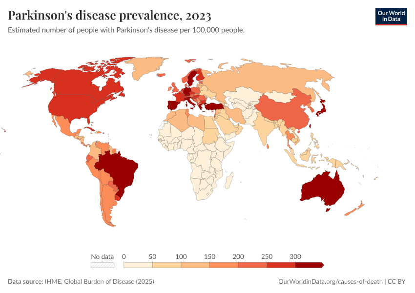 “Data Page: Parkinson's disease prevalence”, part of the following publication: Esteban Ortiz-Ospina and Max Roser (2016) - “Global Health”. Data adapted from IHME, Global Burden of Disease. Retrieved from https://gfs-wave-2-new.owid.pages.dev:8789/20260319-181852/grapher/parkinsons-disease-prevalence-ihme.html [online resource] (archived on March 19, 2026).How to cite this data