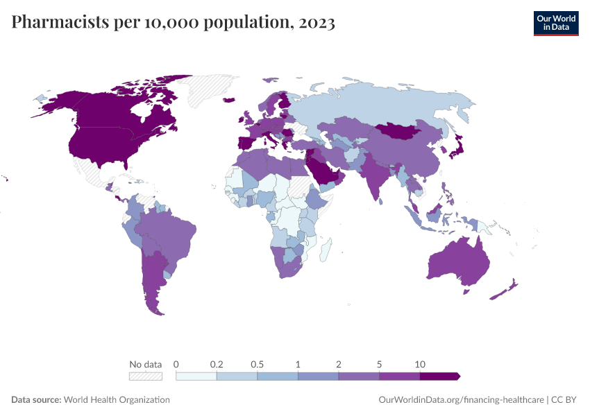 “Data Page: Pharmacists per 10,000 population”. Our World in Data (2026). Data adapted from World Health Organization. Retrieved from https://gfs-wave-2-new.owid.pages.dev:8789/20260304-094028/grapher/pharmaceutical-personnel-per-1000.html [online resource] (archived on March 4, 2026).How to cite this data