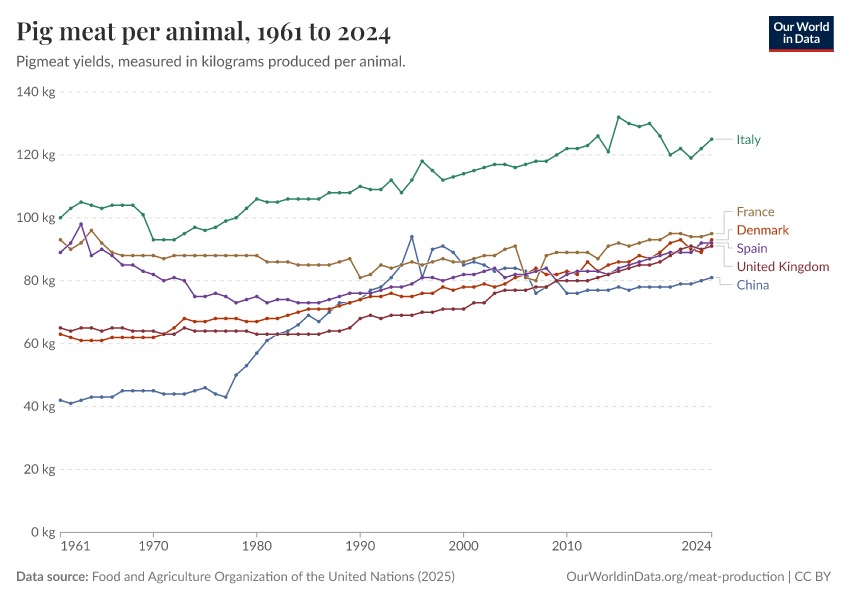Food and Agriculture Organization of the United Nations (2025) – with major processing by Our World in Data. “Pig meat yield per animal – UN FAO” [dataset]. Food and Agriculture Organization of the United Nations, “Production: Crops and livestock products” [original data]. Retrieved April 10, 2026 from https://gfs-wave-2-new.owid.pages.dev:8789/20260304-094028/grapher/pig-yields-meat-per-animal-in-hectograms-100-grams.html (archived on March 4, 2026).Download