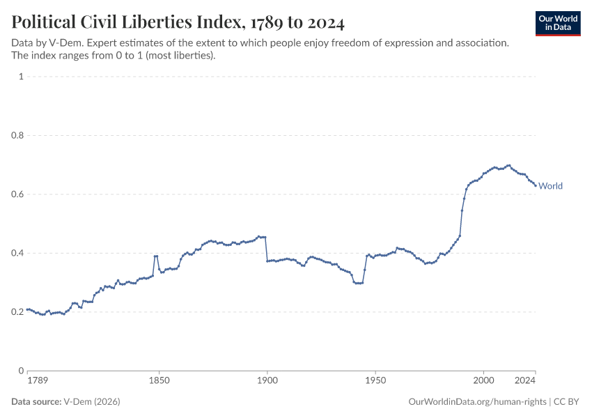 “Data Page: Political civil liberties index”, part of the following publication: Bastian Herre, Lucas Rodés-Guirao, and Esteban Ortiz-Ospina (2013) - “Democracy”. Data adapted from V-Dem. Retrieved from https://gfs-wave-2-new.owid.pages.dev:8789/20260402-164039/grapher/political-civil-liberties-index.html [online resource] (archived on April 2, 2026).