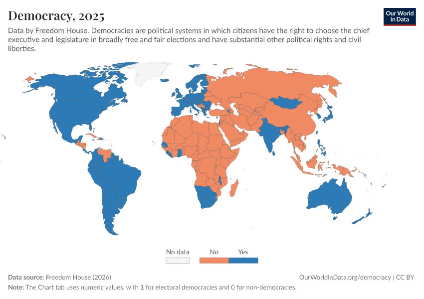 “Data Page: Democracy”, part of the following publication: Bastian Herre, Lucas Rodés-Guirao, and Esteban Ortiz-Ospina (2013) - “Democracy”. Data adapted from Freedom House. Retrieved from https://gfs-wave-2-new.owid.pages.dev:8789/20260323-201304/grapher/political-regime-dem-fh.html [online resource] (archived on March 23, 2026).How to cite this data