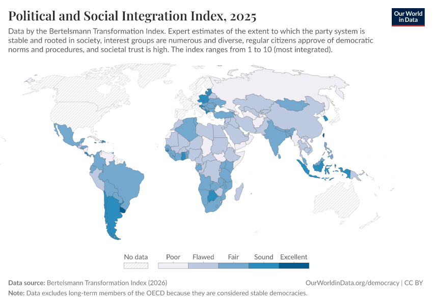 “Data Page: Political and Social Integration Index”, part of the following publication: Bastian Herre, Lucas Rodés-Guirao, and Esteban Ortiz-Ospina (2013) - “Democracy”. Data adapted from Bertelsmann Transformation Index. Retrieved from https://gfs-wave-2-new.owid.pages.dev:8789/20260327-184752/grapher/political-social-integration-index-bti.html [online resource] (archived on March 27, 2026).How to cite this data