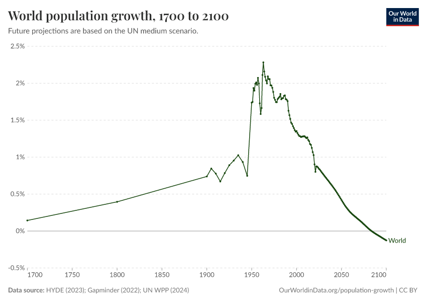 “Data Page: World population growth”, part of the following publication: Hannah Ritchie, Lucas Rodés-Guirao, Edouard Mathieu, Marcel Gerber, Esteban Ortiz-Ospina, Joe Hasell, and Max Roser (2023) - “Population Growth”. Data adapted from PBL Netherlands Environmental Assessment Agency, Gapminder, United Nations. Retrieved from https://gfs-wave-2-new.owid.pages.dev:8789/20260402-163007/grapher/population-growth-rate.html [online resource] (archived on April 2, 2026).How to cite this data