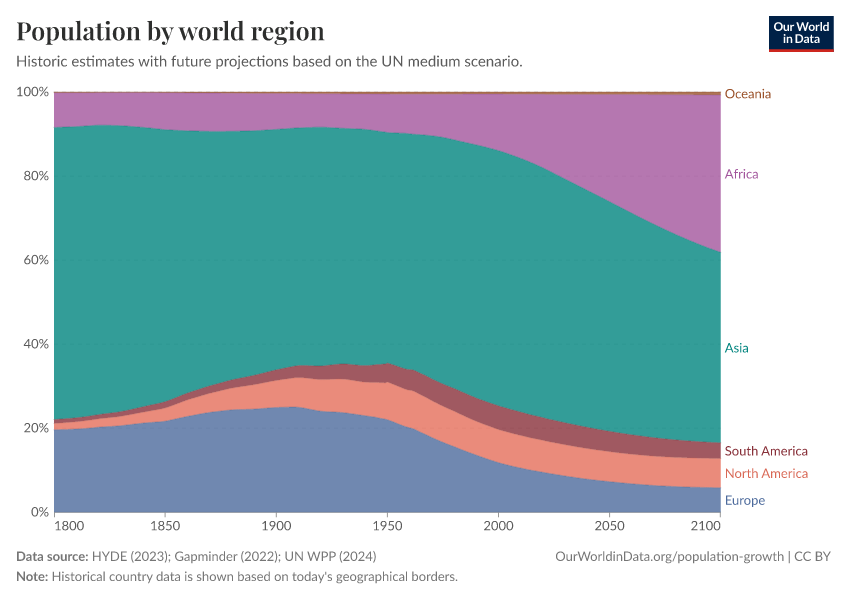 HYDE (2023); Gapminder (2022); UN WPP (2024) – with major processing by Our World in Data. “Population by world region” [dataset]. PBL Netherlands Environmental Assessment Agency, “History Database of the Global Environment 3.3”; Gapminder, “Population v7”; United Nations, “World Population Prospects”; United Nations, “World Population Prospects - Interim Update”; Gapminder, “Systema Globalis” [original data]. Retrieved April 10, 2026 from https://gfs-wave-2-new.owid.pages.dev:8789/20260402-163007/grapher/population-regions-with-projections.html (archived on April 2, 2026).Download