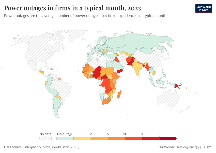 “Data Page: Power outages in firms in a typical month”. Our World in Data (2026). Data adapted from Enterprise Surveys, World Bank. Retrieved from https://gfs-wave-2-new.owid.pages.dev:8789/20260304-094028/grapher/power-outages-in-firms-per-month.html [online resource] (archived on March 4, 2026).How to cite this data