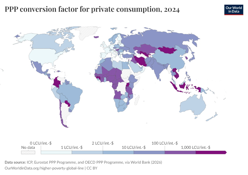“Data Page: PPP conversion factor for private consumption”. Our World in Data (2026). Data adapted from ICP, Eurostat PPP Programme, and OECD PPP Programme, via World Bank. Retrieved from https://gfs-wave-2-new.owid.pages.dev:8789/20260304-094028/grapher/ppp-conversion-factor-for-private-consumption.html [online resource] (archived on March 4, 2026).How to cite this data