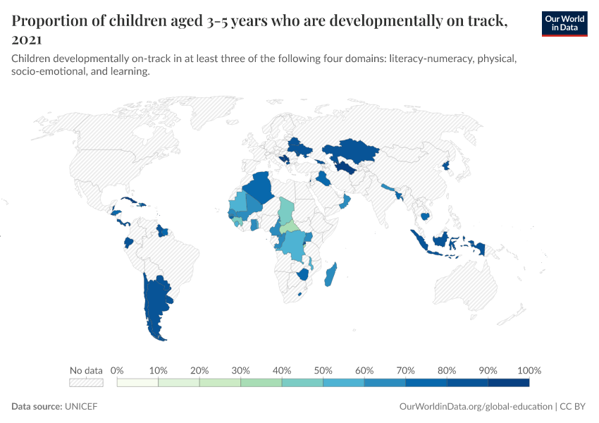 “Data Page: Proportion of children aged 3-5 years who are developmentally on track”. Our World in Data (2026). Data adapted from UNICEF. Retrieved from https://gfs-wave-2-new.owid.pages.dev:8789/20260304-094028/grapher/proportion-of-children-developmentally-on-track.html [online resource] (archived on March 4, 2026).How to cite this data