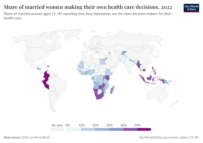 “Data Page: Share of married women making their own health care decisions”, part of the following publication: Bastian Herre, Veronika Samborska, Pablo Arriagada, and Hannah Ritchie (2023) - “Women’s Rights”. Data adapted from World Bank Gender Statistics. Retrieved from https://gfs-wave-2-new.owid.pages.dev:8789/20260304-094028/grapher/proportion-of-women-who-make-their-own-informed-health-care-decisions.html [online resource] (archived on March 4, 2026).How to cite this data