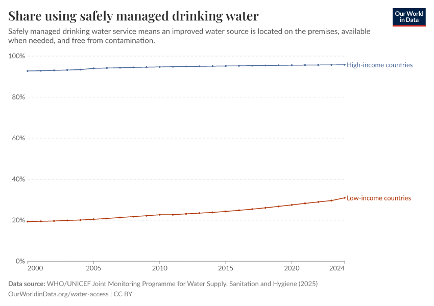 WHO/UNICEF Joint Monitoring Programme for Water Supply, Sanitation and Hygiene (2025) – processed by Our World in Data. “Share using safely managed drinking water” [dataset]. World Health Organization/UNICEF Joint Monitoring Programme for Water Supply, Sanitation and Hygiene, “WHO/UNICEF Joint Monitoring Programme for Water Supply, Sanitation and Hygiene (JMP) 2000-2024 report” [original data]. Retrieved April 10, 2026 from https://gfs-wave-2-new.owid.pages.dev:8789/20260304-094028/grapher/proportion-using-safely-managed-drinking-water.html (archived on March 4, 2026).Download