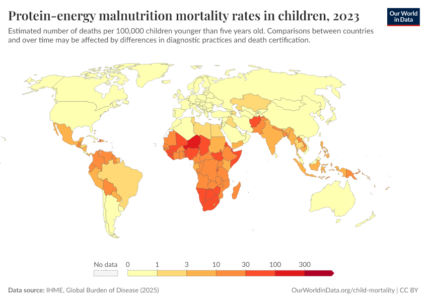IHME, Global Burden of Disease (2025) – with major processing by Our World in Data. “Protein-energy malnutrition mortality rates in children – IHME” [dataset]. IHME, Global Burden of Disease, “Global Burden of Disease - Deaths” [original data]. Retrieved April 10, 2026 from https://gfs-wave-2-new.owid.pages.dev:8789/20260330-100833/grapher/protein-energy-malnutrition-mortality-rates-in-children.html (archived on March 30, 2026).