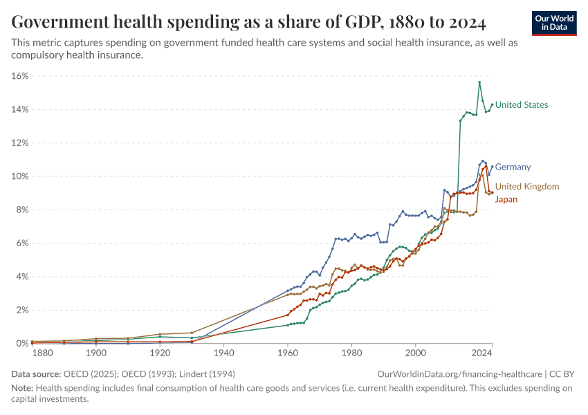 OECD (2025); OECD (1993); Lindert (1994) – with major processing by Our World in Data. “Public health expenditure as a share of GDP – Lindert, OECD – Historical data” [dataset]. OECD, “OECD Health Expenditure and Financing Database”; OECD, “OECD Health Systems”; Lindert, “The rise of social spending (1880-1930)” [original data]. Retrieved April 10, 2026 from https://gfs-wave-2-new.owid.pages.dev:8789/20260304-094028/grapher/public-health-expenditure-share-gdp.html (archived on March 4, 2026).Download
