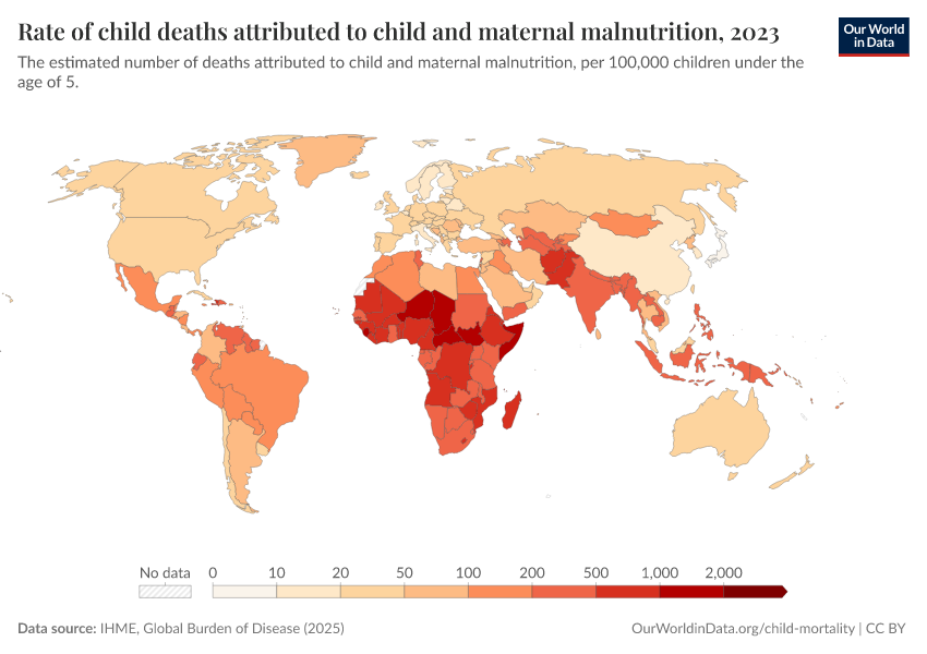 “Data Page: Rate of child deaths attributed to child and maternal malnutrition”, part of the following publication: Esteban Ortiz-Ospina and Max Roser (2016) - “Global Health”. Data adapted from IHME, Global Burden of Disease. Retrieved from https://gfs-wave-2-new.owid.pages.dev:8789/20260319-180505/grapher/rate-of-child-deaths-attributed-to-child-and-maternal-malnutrition.html [online resource] (archived on March 19, 2026).How to cite this data