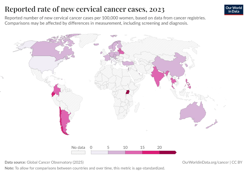 Global Cancer Observatory (2025) – processed by Our World in Data. “Reported rate of new cervical cancer cases” [dataset]. Global Cancer Observatory, “Cancer over time - Cervical cancer” [original data]. Retrieved April 10, 2026 from https://gfs-wave-2-new.owid.pages.dev:8789/20260304-094028/grapher/reported-rate-of-new-cervical-cancer-cases.html (archived on March 4, 2026).Download