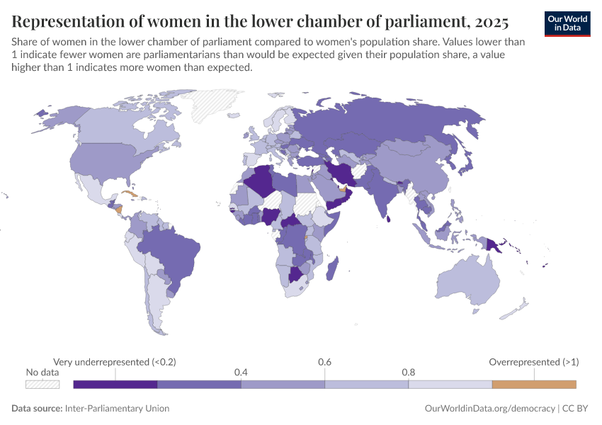 “Data Page: Representation of women in the lower chamber of parliament”. Our World in Data (2026). Data adapted from Inter-Parliamentary Union. Retrieved from https://gfs-wave-2-new.owid.pages.dev:8789/20260304-094028/grapher/representation-of-women-in-lower-chamber-of-parliament.html [online resource] (archived on March 4, 2026).How to cite this data